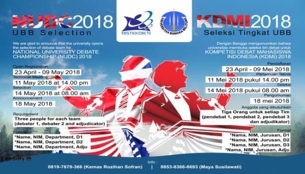 Universitas Bangka Belitung Tahun 2018 mengadakan Seleksi debat berbahasa Inggris, National University Debating Championship (NUDC) dan lomba debat berbahasa Indonesia Tingkat Universitas, Untuk NUDC akan dilaksanakan pada tanggal 23 April s.d. 18 Mei 2018 sedangkan (KDMI) yang pada tahun ini akan dilaksanakan pada tanggal 23 April s.d. 18 Mei 2018,
